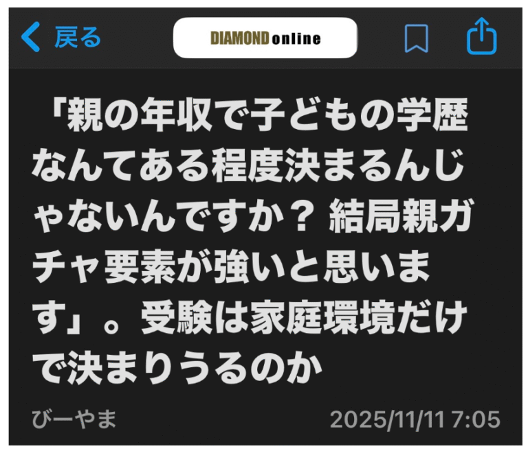 「親の年収で子どもの学歴なんてある程度決まるんじゃないんですか? 結局親ガチャ要素が強いと思います」。受験は家庭環境だけで決まりうるのか (ダイヤモンド・オンライン)