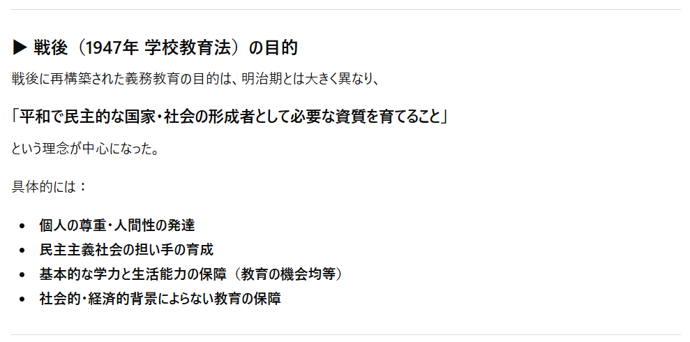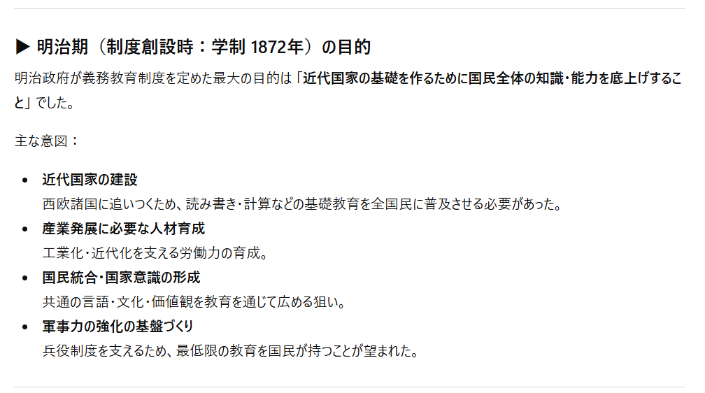 そもそも、義務教育が制定された目的な何なのか。chatGPTに説明させたところ、以下のような返答があった。