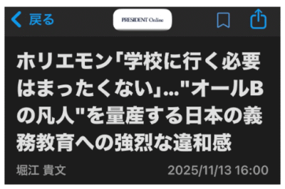 “ホリエモン「学校に行く必要はまったくない」…”オールBの凡人”を量産する日本の義務教育への強烈な違和感” – PRESIDENT Online #SmartNews